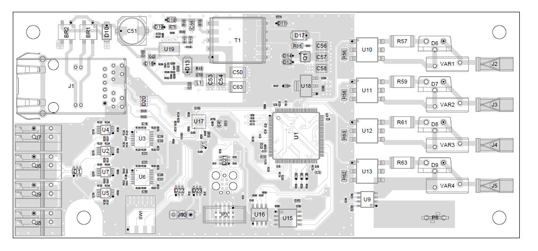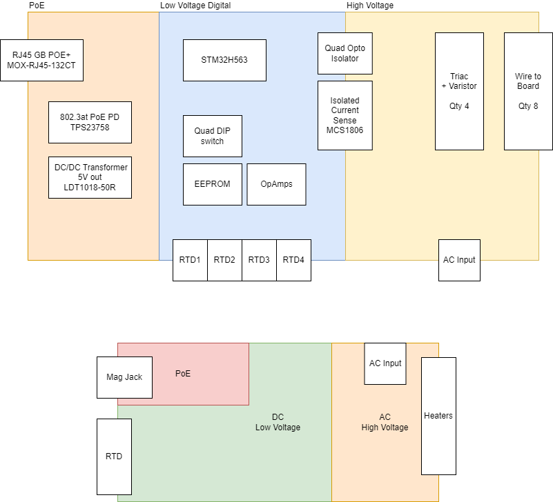The PCB is isolated into 3 areas. First is the PoE section isolated from the digital section via 48V to 5V transformer. The digital section is isolated from the Triac high voltage section using opt isolators.